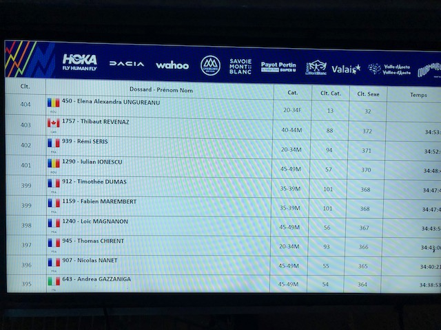 Nous repartons vers Chamonix et, depuis la route, nous observons une guirlande lumineuse de coureurs qui grimpent à flanc de montagne dans la nuit noire: quel spectacle!